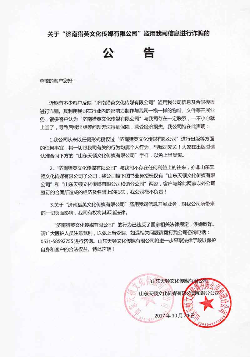 关于“济南猎英文化传媒有限公司”盗用我司信息进行诈骗的 公告