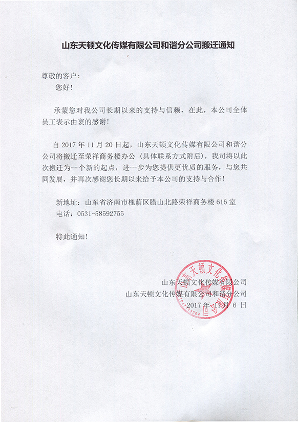 山东天顿文化传媒有限公司和谐分公司搬迁通知