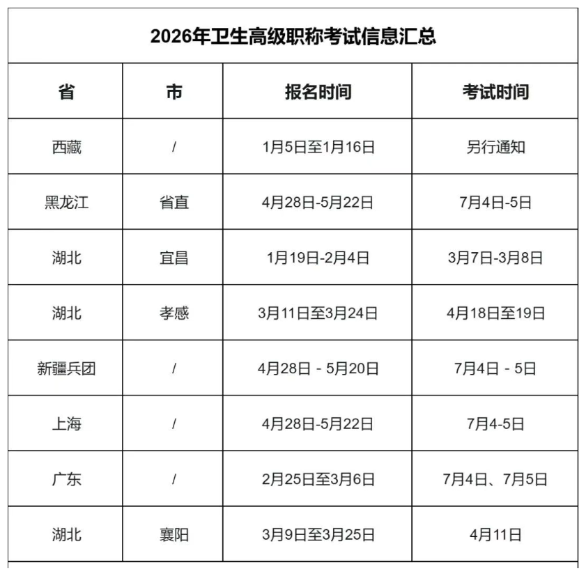广东、上海、新疆兵团、黑龙江等考区也已经公布2026年卫生高级职称报考通知,阿虎帮大家汇总如下: