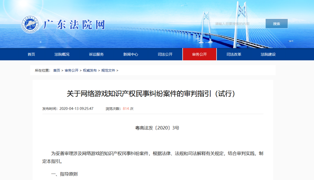 编者按:4月13日,广东省高级人民法院发布《关于网络游戏知识产权民事纠纷案件的审判指引(试行)》,对网络游戏纠纷案件的权益保护、侵权认定和赔偿原则作出明确规定。为了帮助广东全省各级法院及业内相关人士参考理解与适用该审判指引,广东省高级人民法院对该指引做出了逐条说明。现将指引全文及逐条说明发布如下: