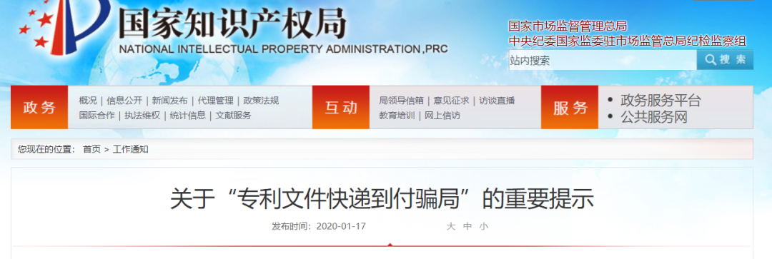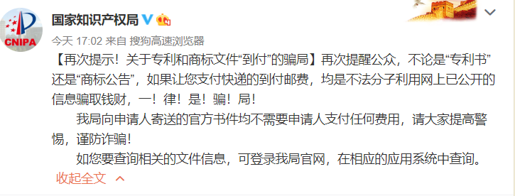 6月28日,国家知识产权局通过官方微博发布了《再次提示!关于专利和商标文件“到付”的骗局》,再次提醒公众,不论是“专利书”还是“商标公告”,如果让您支付快递的到付邮费,均是不法分子利用网上已公开的信息骗取钱财,一!律!是!骗!局!